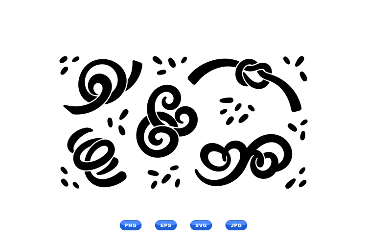 Bold flat design vector ornaments display black swirl motifs and knot shapes used as logo accents branding patterns and decorative layouts vibrant