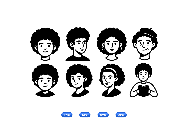 A flat vector illustrates eight curly haired avatars in black and white showing varied expressions accessories and angles for profile icons social media and branding playful