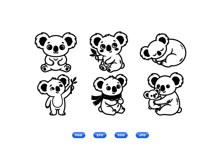 Playful line art vector depicts six koala characters in varied poses with leaf and baby motifs for stickers apparel icons and childrens projects charming