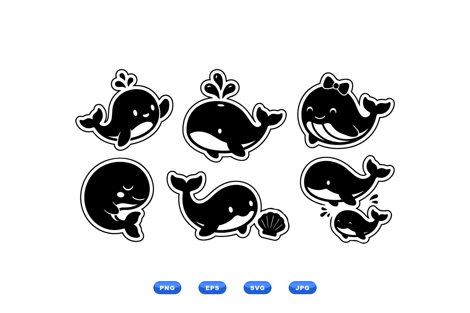 A kawaii sticker sheet depicts smiling black and white whale characters with playful poses and shell detail vector art for branding social media and kids designs cheerful