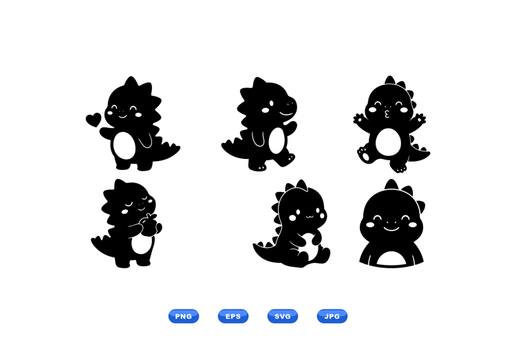 They present a playful of six kawaii dinosaur vector silhouettes showing smiling baby dinos holding hearts walking and sitting for stickers icons and children projects cheerful