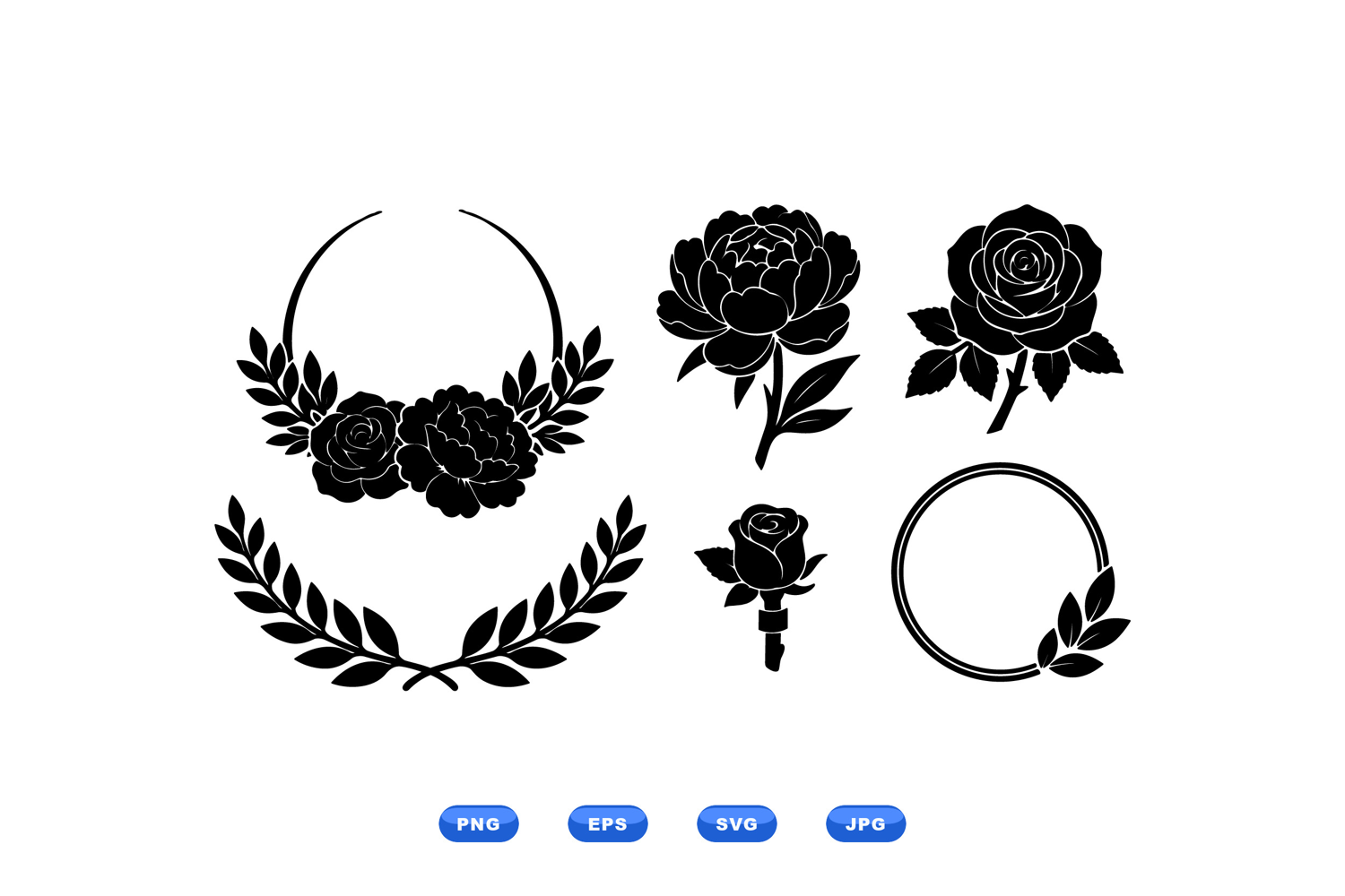 A of black silhouette floral vector icons includes wreaths roses peony boutonniere laurel branches and circular frames for branding invitations editorial designs elegant