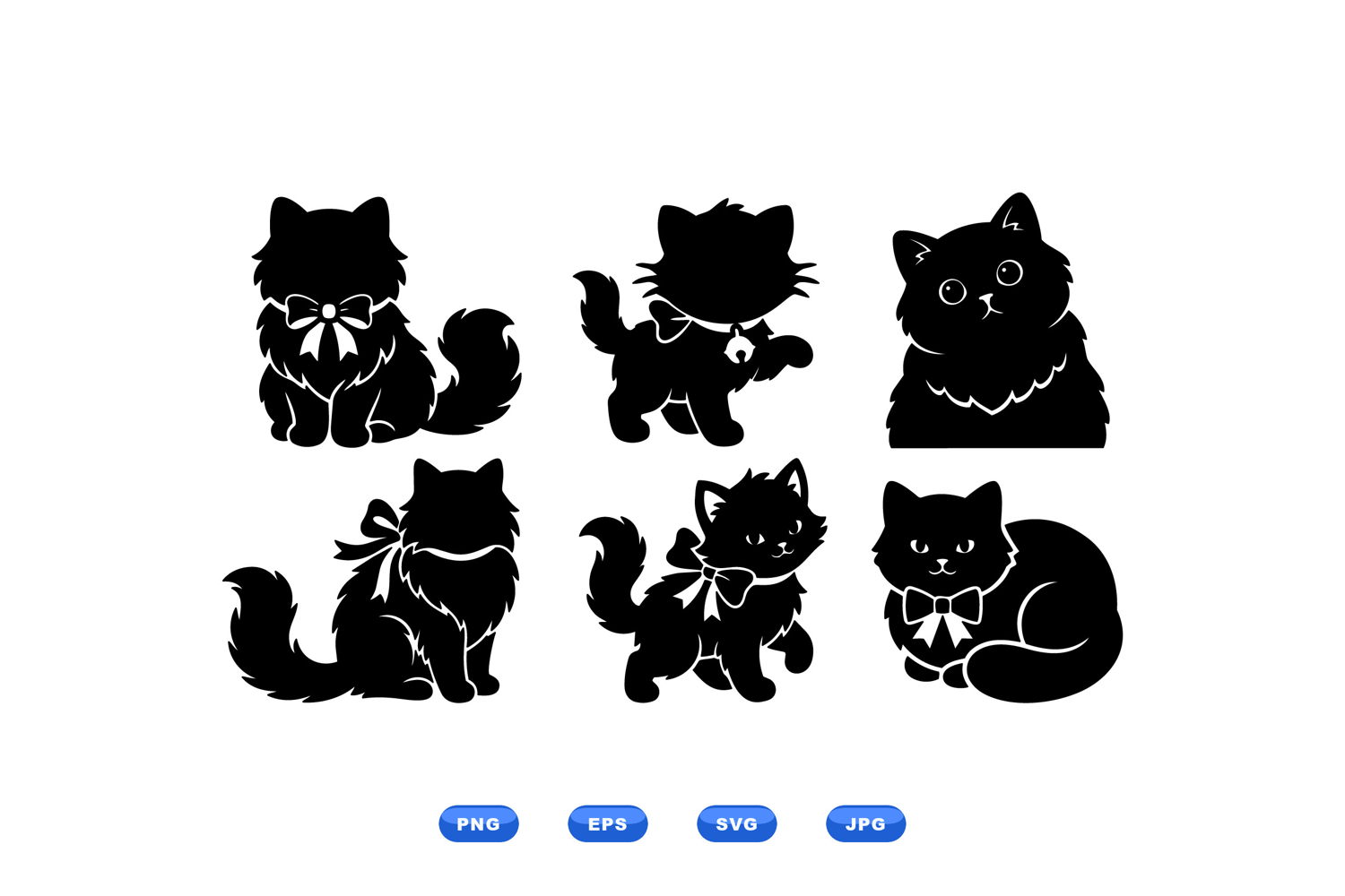 A playful of six black cat silhouettes with decorative bows in flat vector style used for icons stickers apparel and web design adorable