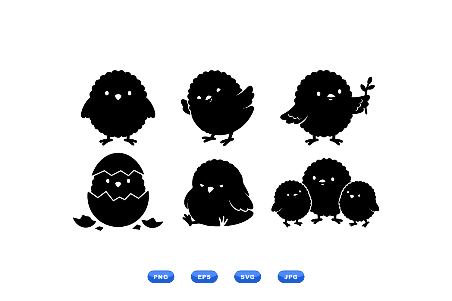 A flat vector depicts six chick silhouettes including hatching egg branch holder and family trio used for icons stickers nursery decor soft playful