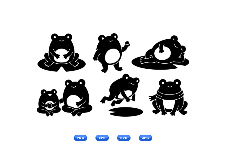 A flat minimalist vector depicts smiling frog silhouettes in various poses for stickers icons children projects and branding with a playful calm mood