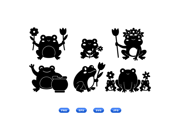 A flat silhouette vector shows six smiling frogs holding flowers in playful poses for icons stickers and craft projects cheerful