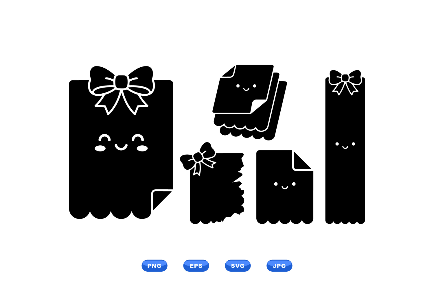 Playful flat design vector shows smiling scalloped paper sheets with bows and curled corners used for packaging labels stationery and craft projects cheerful