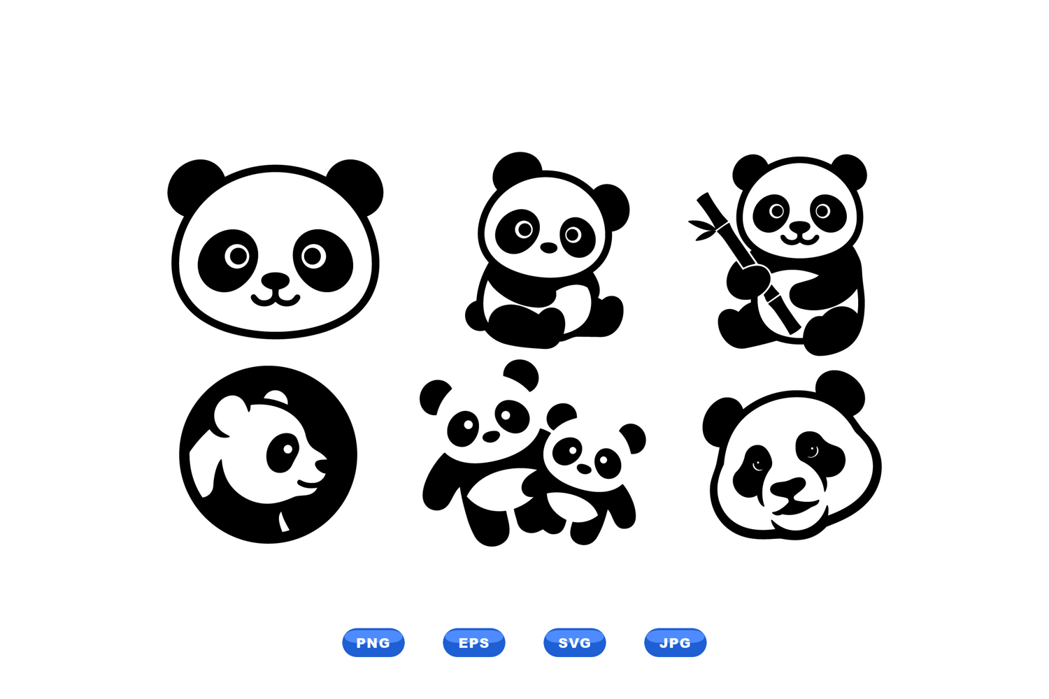 Playful flat vector shows six panda icons including headshot sitting panda holding bamboo and two pandas together for logos stickers branding