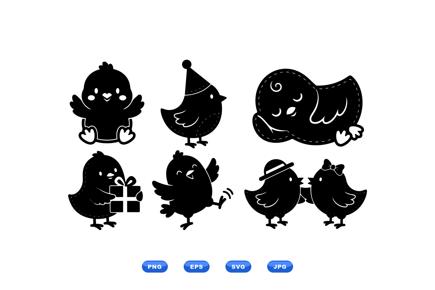 A flat vector presents playful chick silhouettes in minimal style for stickers apparel and nursery decor projects lively whimsical