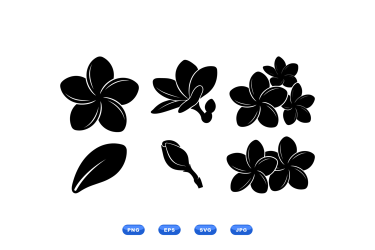 A minimalist black silhouette vector shows plumeria flowers buds and a leaf in isolated compositions for logos icons patterns and botanical design uses serene