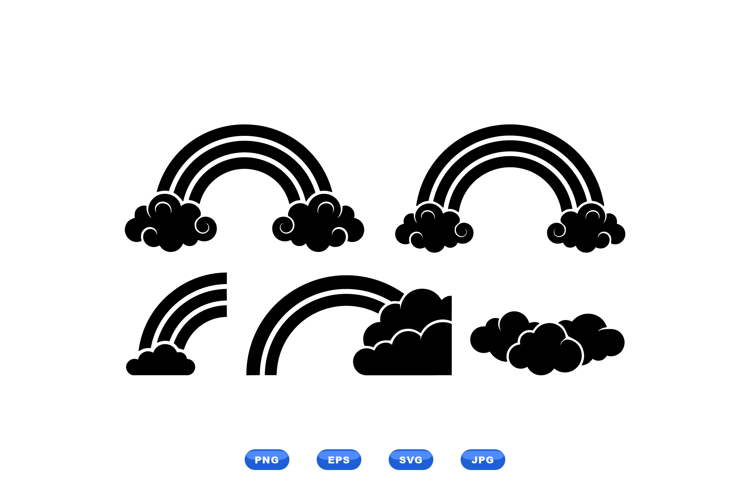 A flat design vector displays five black rainbow and cloud silhouettes for web icons branding and print projects with minimal playful mood