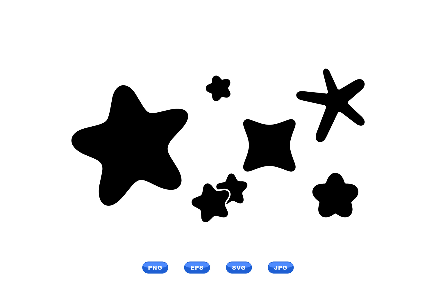 Playful flat vector displays irregular black star shapes scattered on a white canvas useful for icons stickers and pattern backgrounds creating bold minimal graphic impact