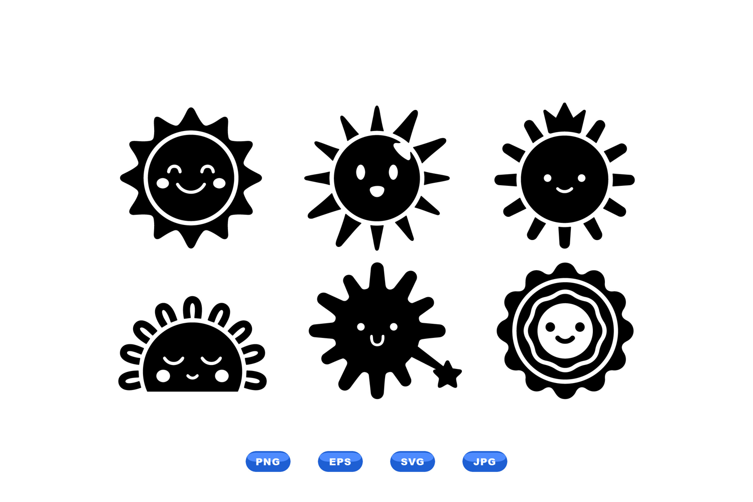 A of six flat sun icon vectors shows smiling and sleeping faces with varied ray shapes for logos stickers and children s editorial art cheerful