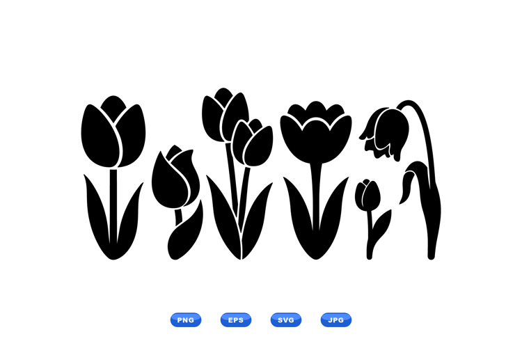 A minimalist vector shows black tulip silhouettes arranged horizontally with varied bud shapes and stems for icons labels and decorative patterns calm