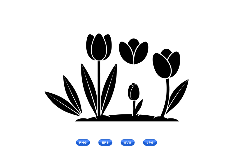 A flat vector shows black tulip silhouettes arranged on soil with three open flowers and one bud in side view suitable for icons signage and minimalist layouts serene