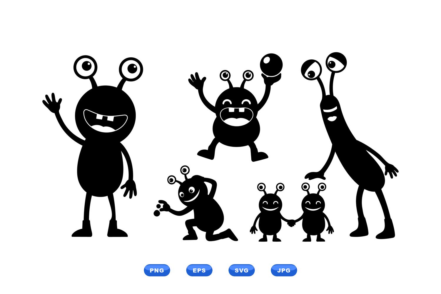 A flat vector silhouette shows playful two eyed alien characters in various poses for stickers childrens books and branding use vibrant