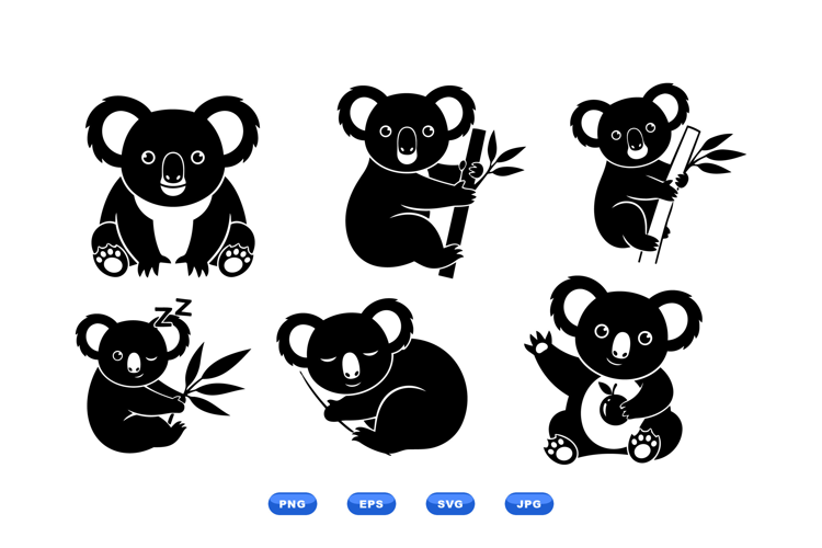 A flat vector depicting six koala poses including sitting hugging climbing sleeping and waving in minimalist black silhouette style for icons stickers and branding playful