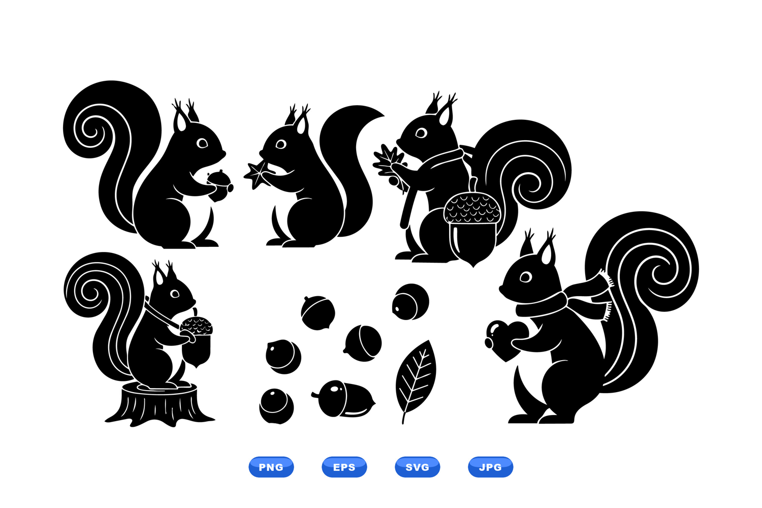 A silhouette vector depicts playful squirrels with acorns hearts and a leaf in flat black style for stickers logos and seasonal craft design playful