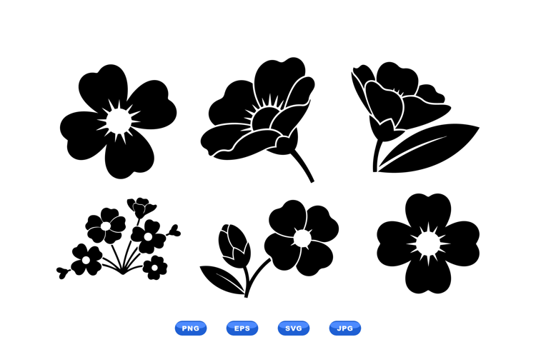 A minimalist vector displays six black floral silhouettes for logos packaging patterns web icons and stationery design used in calm compositions