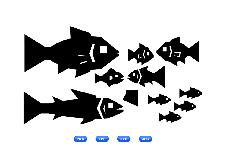 A minimalist flat vector shows black fish silhouettes in a school across white space offering icon for signage branding and pattern design bold