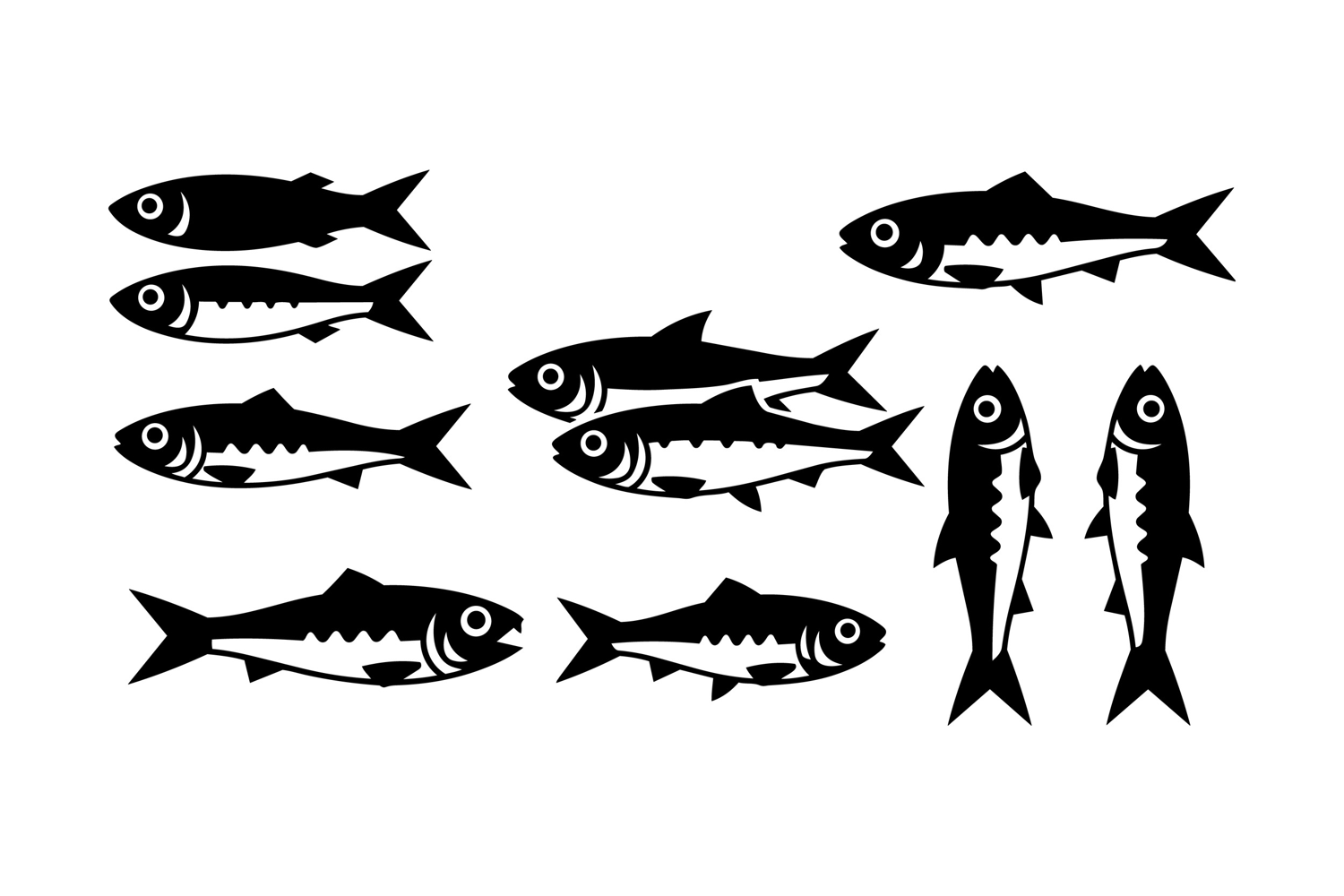 A flat minimalist vector shows multiple sardine silhouettes in black arranged in rows and pairs for packaging labels and seafood branding vibrant