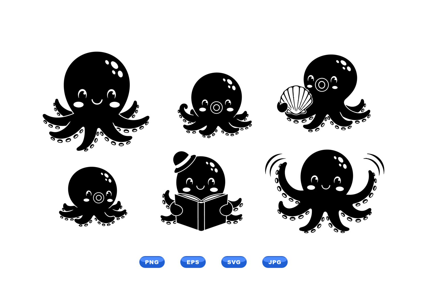 The presents six playful octopus vectors in flat black silhouette showing smiling faces holding shell and book soft cheerful
