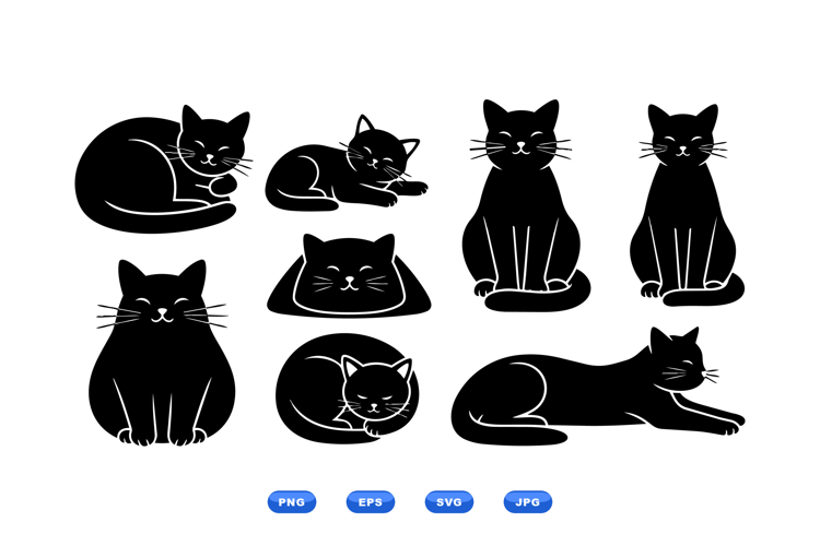 A of flat black cat silhouettes displays varied sleeping sitting and stretching poses for icons stickers branding and web use calm and minimal