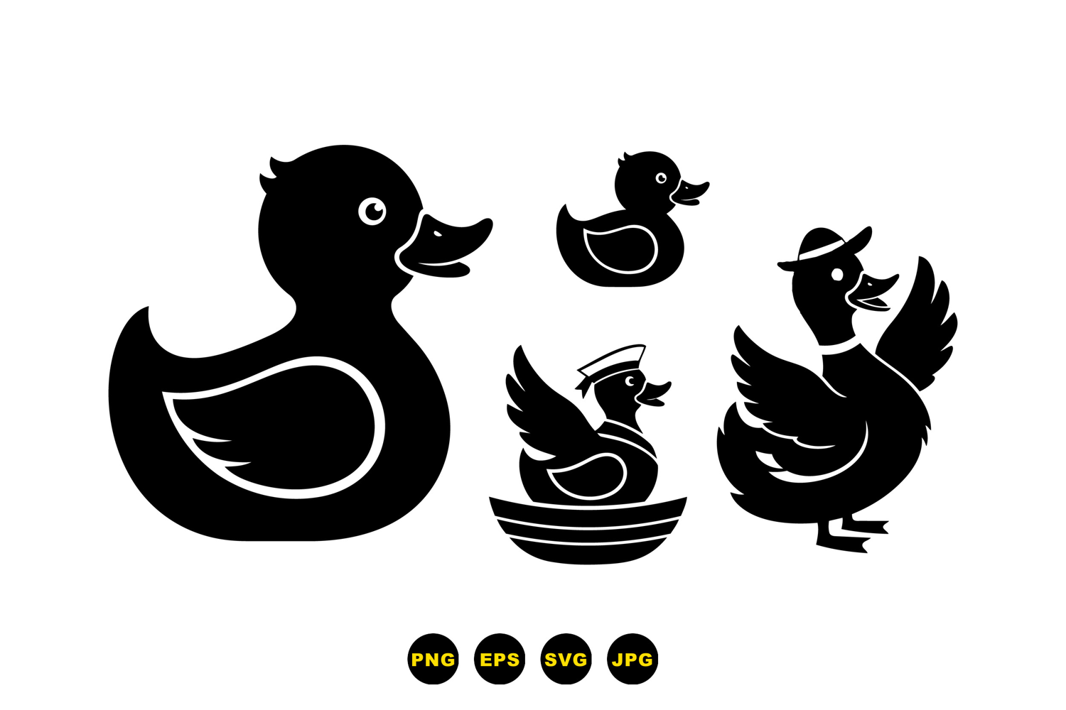 A of flat vector rubber duck silhouettes displays varied poses and accessories for icon sets stickers and children products playful and bold