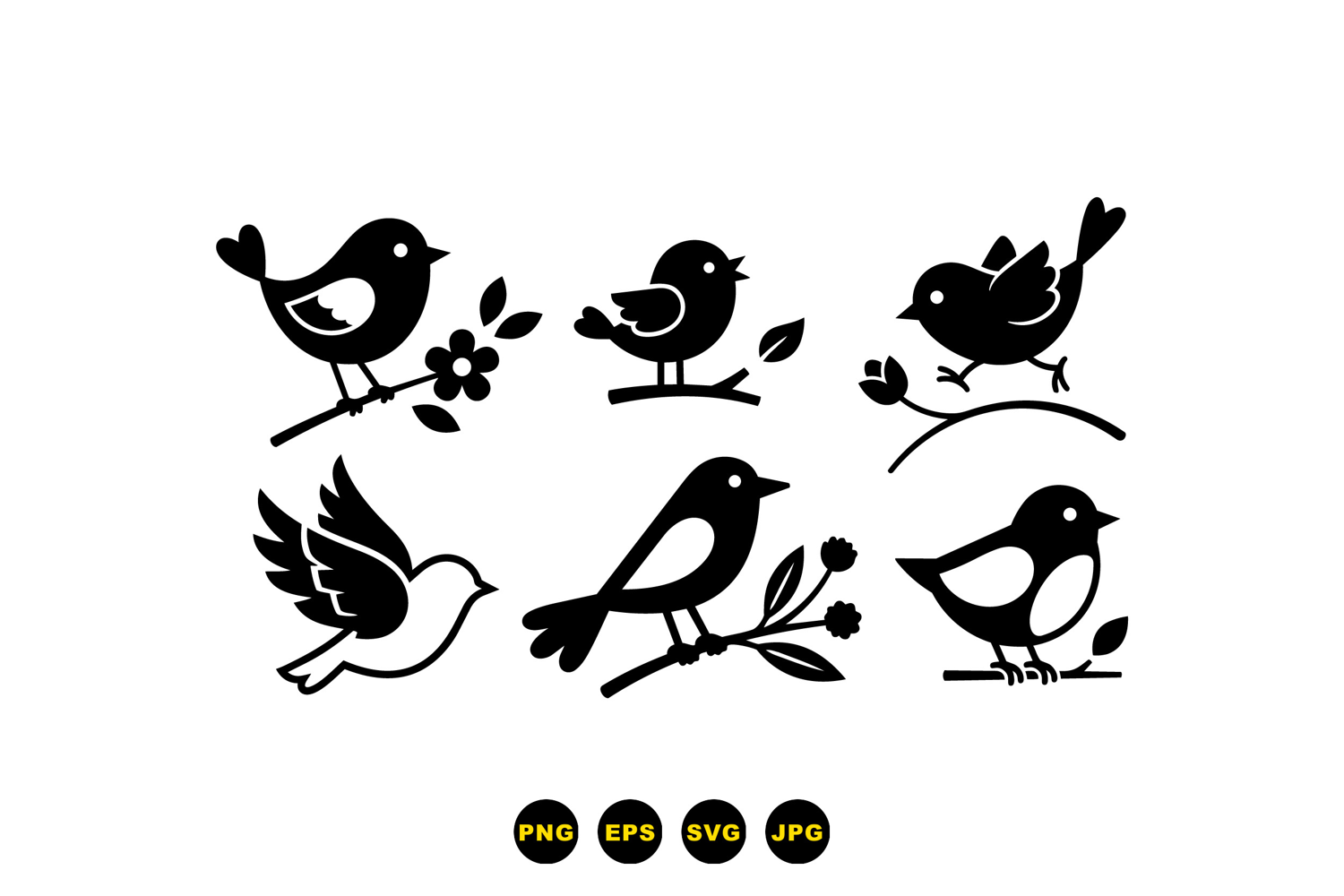 A flat design icon depicts six stylized bird silhouettes perched on branches and blossoms for logos social media labels and craft projects playful
