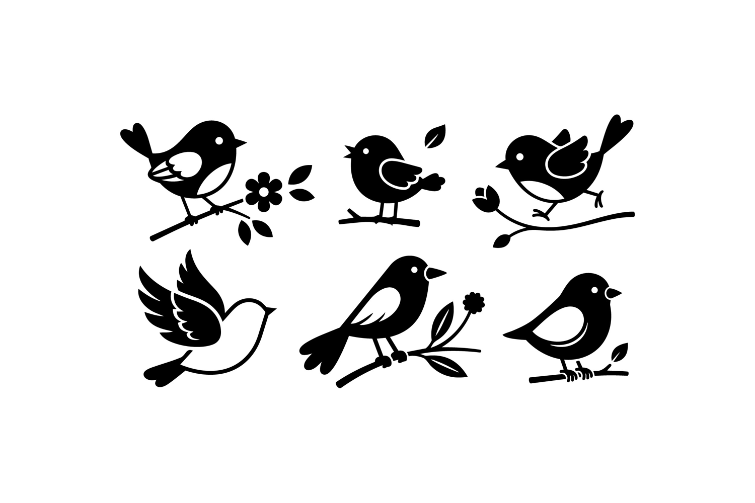 A minimalist flat vector showing six black bird silhouettes perched and flying on branches with floral accents for logos posters and print charming