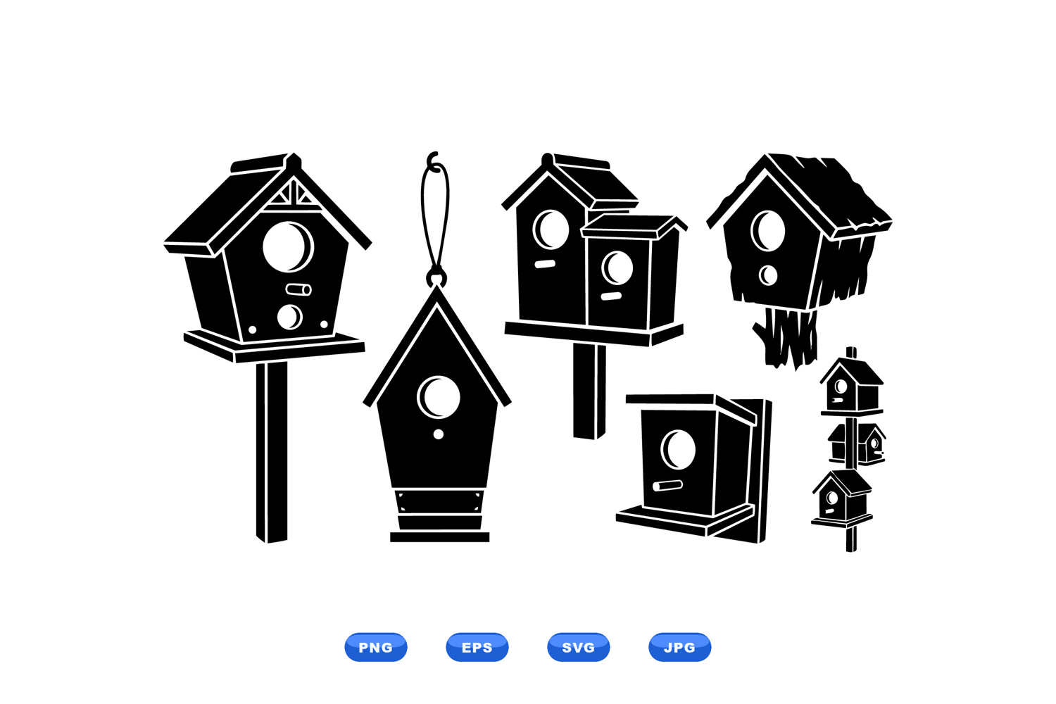 A bold silhouette vector depicts assorted wooden birdhouses on posts hanging and mounted with clean cutout shapes for logos icons and nature themed designs vibrant