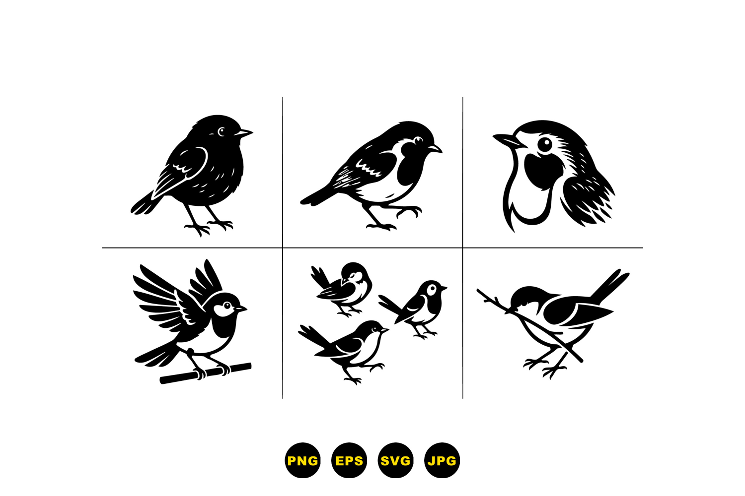 A flat vector displays six black bird silhouettes in varied poses including perched flying holding a twig and a close up head view serene