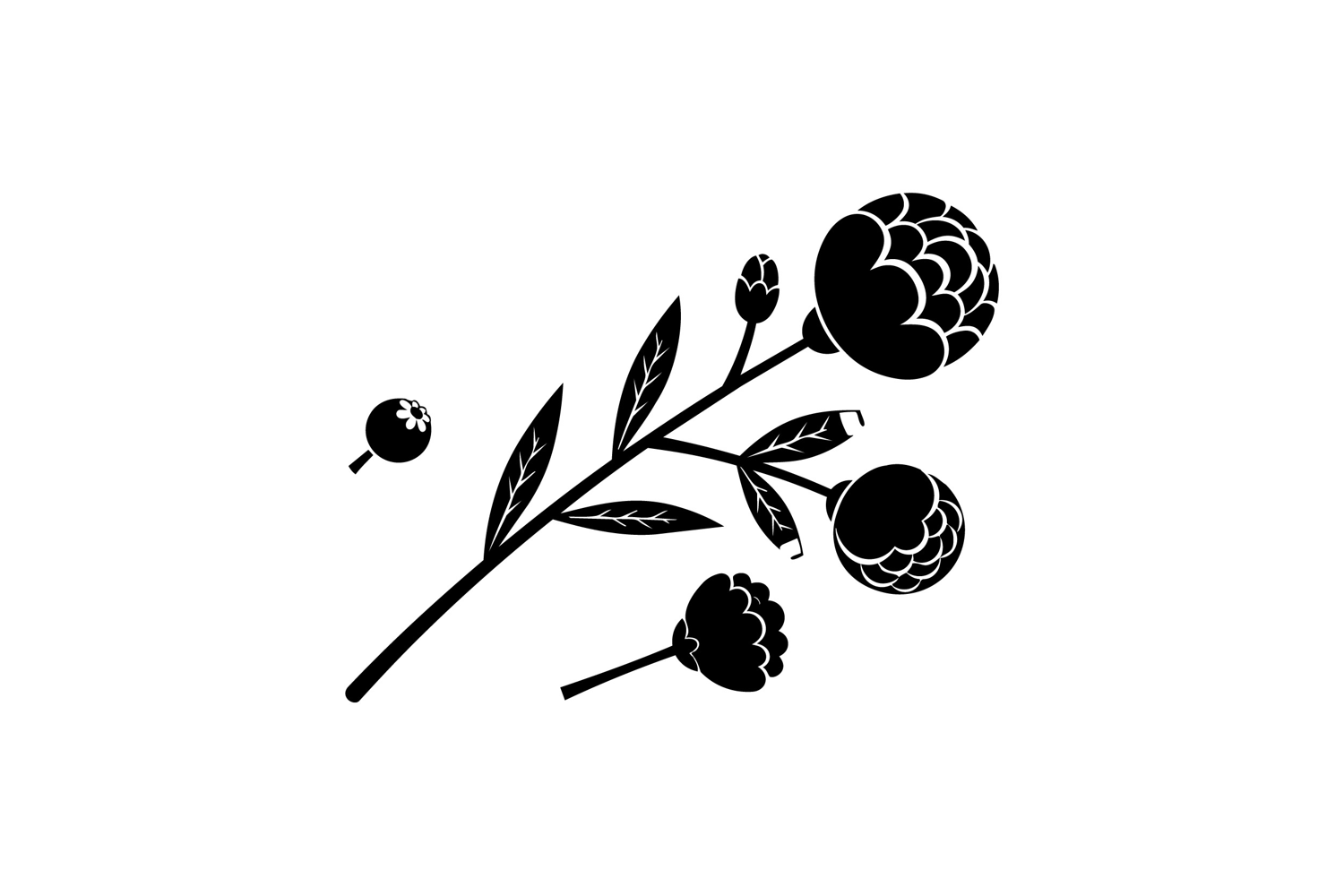 A flat monochrome vector shows a stylized berry branch with buds leaves and blossoms in silhouette for logos patterns and packaging quiet elegant