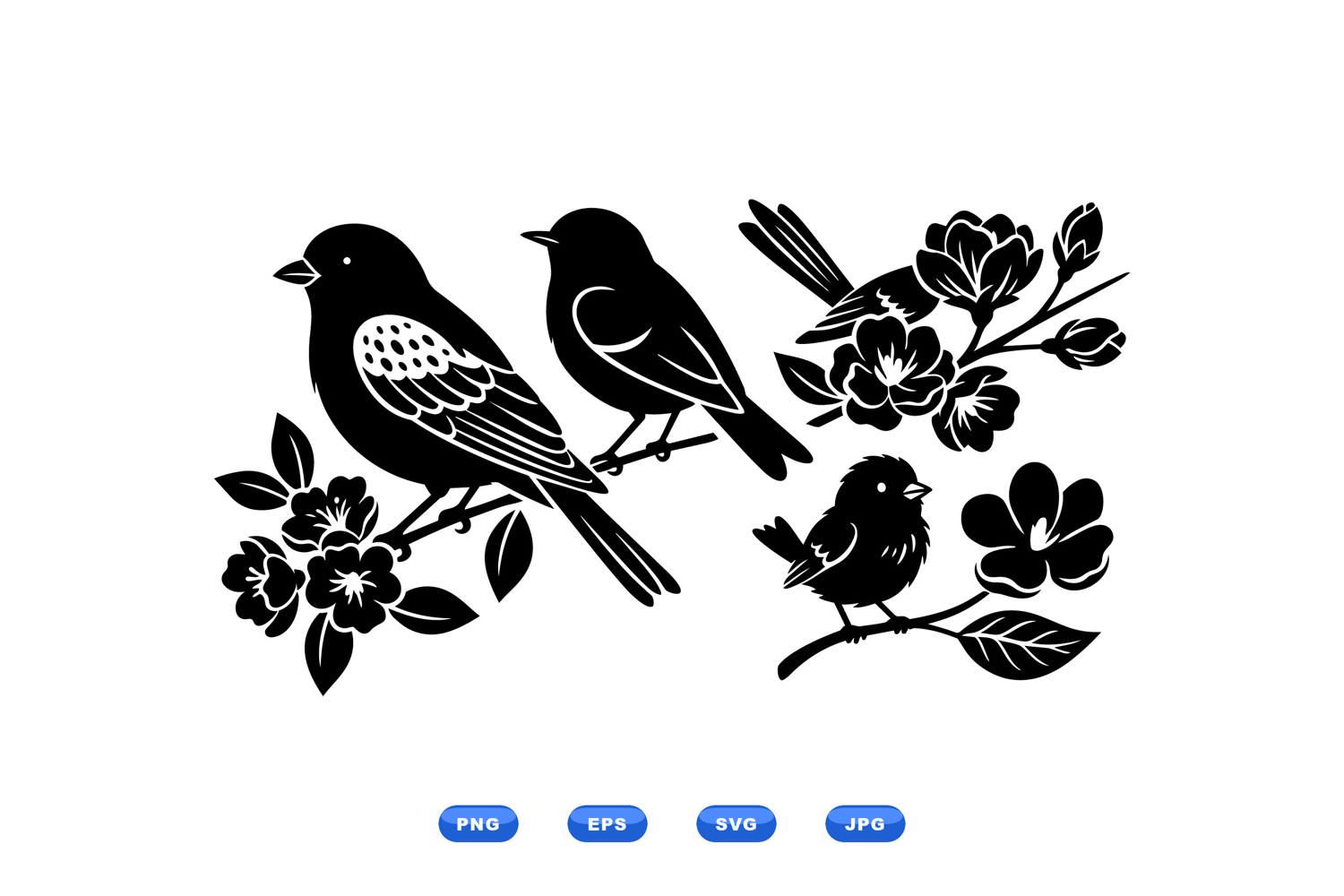 A silhouette vector shows three birds on flowering branches in bold black and white used in logos stickers and packaging elegant