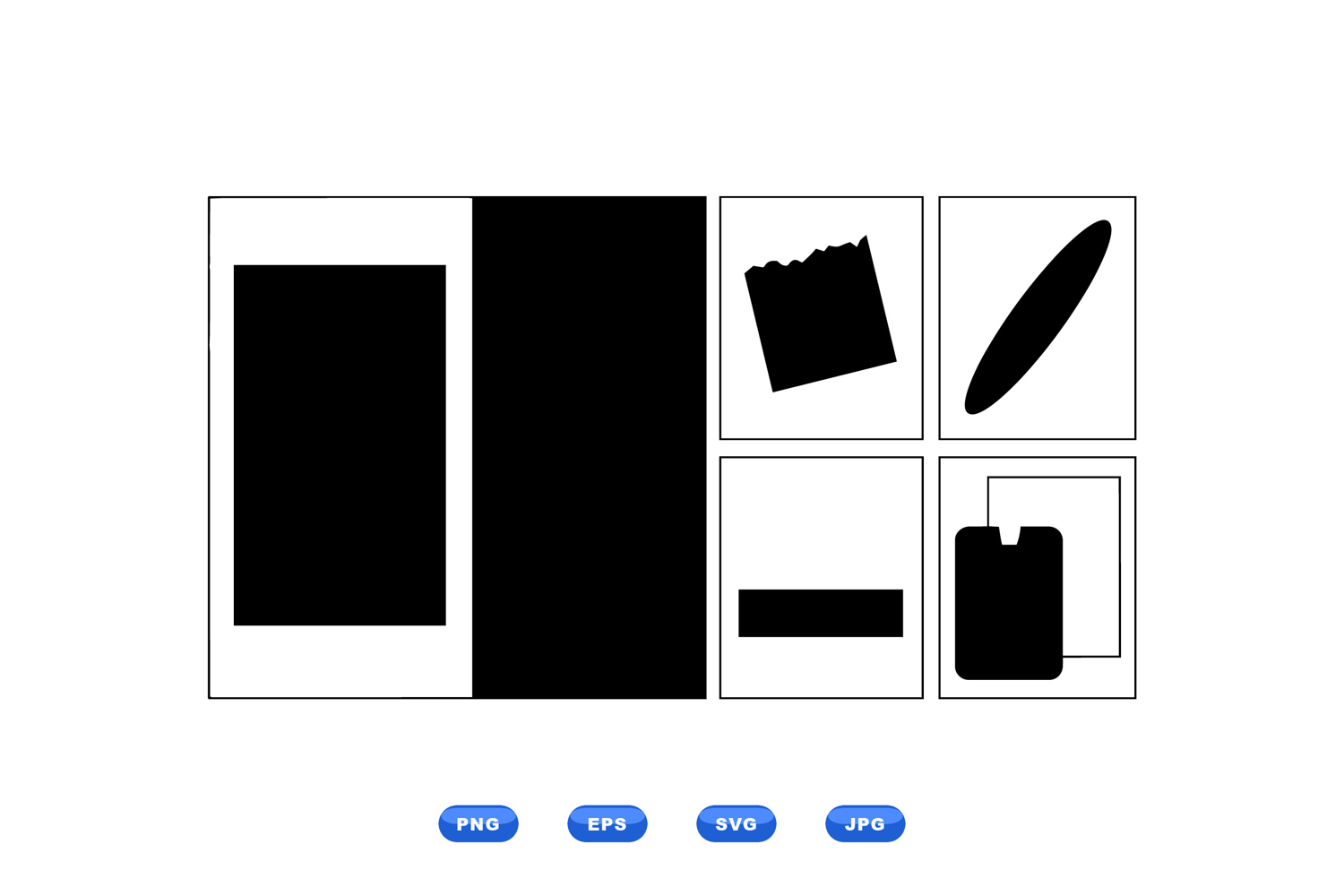 A minimalist flat vector displays six panel shapes including a large black block square rounded tablet and oval element suggesting interface layout and bold contrast