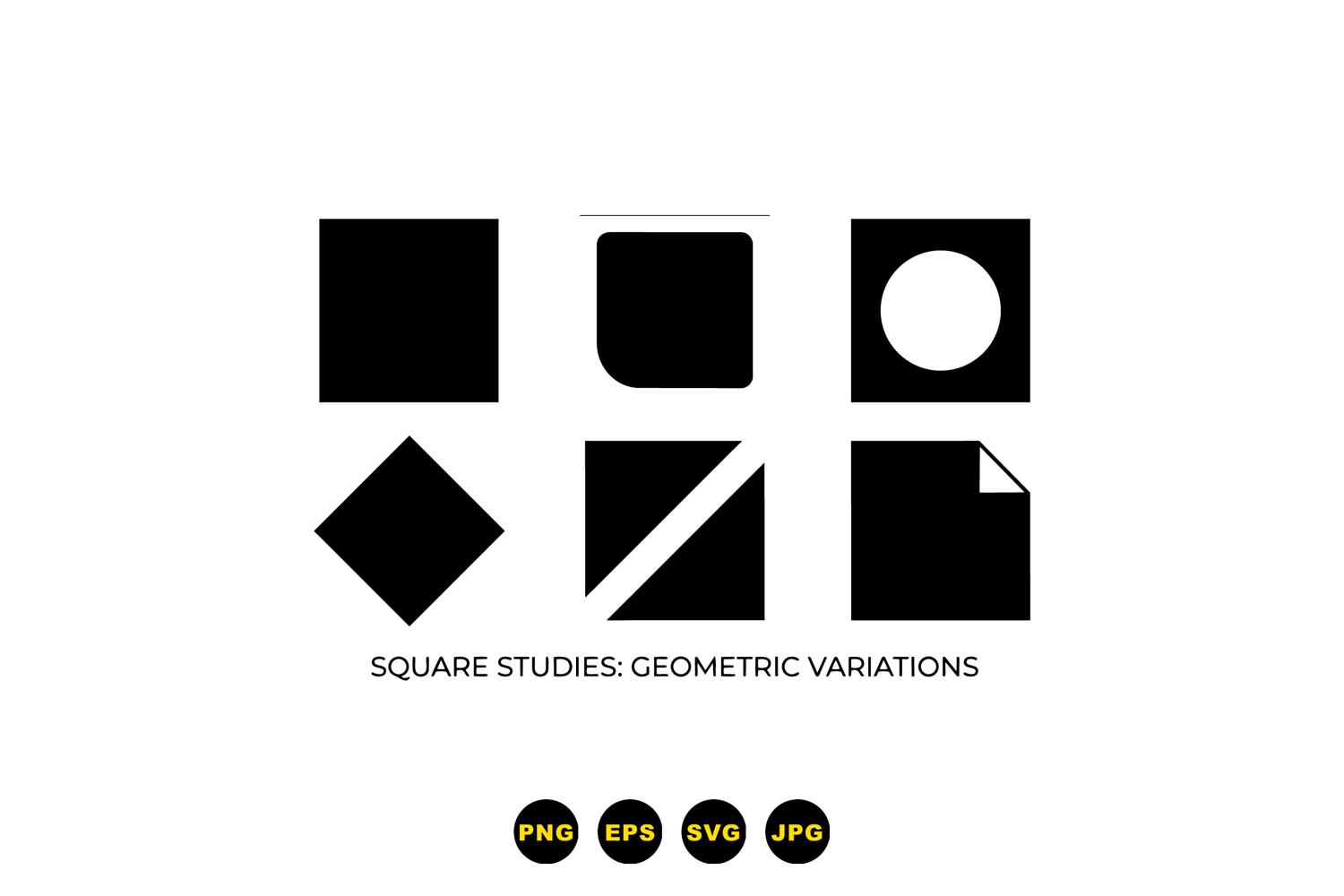 A minimalist flat design displays six black square variations with rounded corners rotated diamond diagonal cutout and corner fold for logo mockups editorial layouts minimal