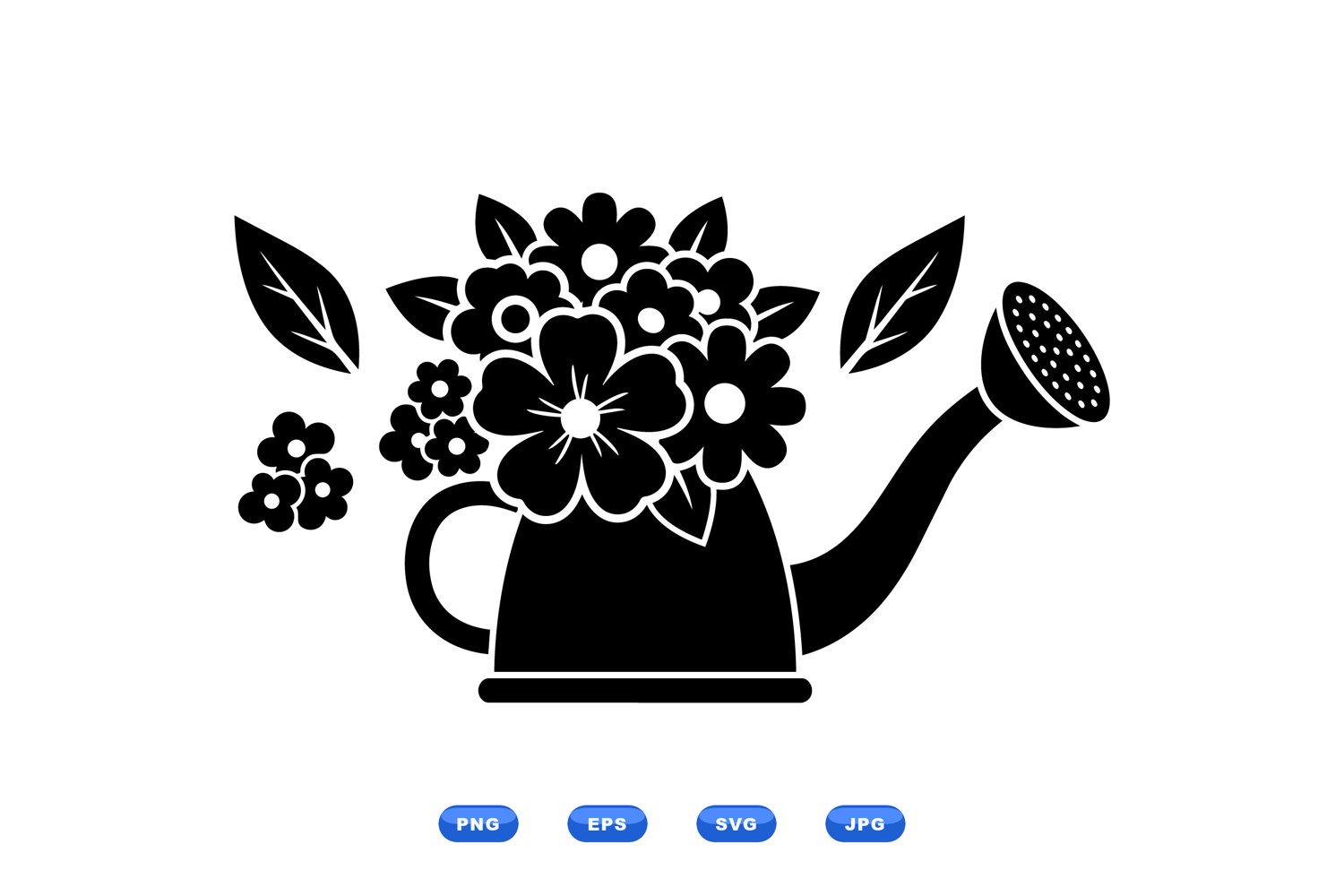 A flat design vector shows a watering can filled with blooming flowers and scattered leaves for gardening branding apparel prints and spring decor vibrant