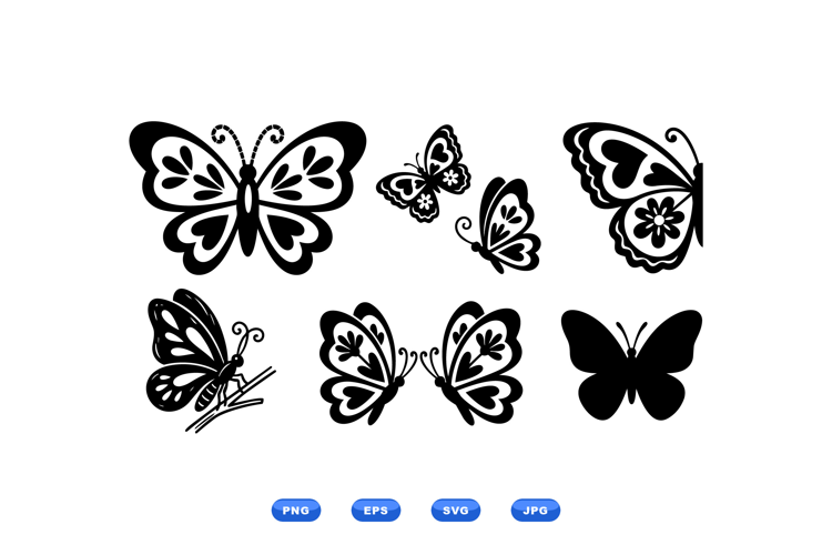 A flat vector displays seven decorative butterfly silhouettes in black and white used in logos stickers craft projects nature themed design playful