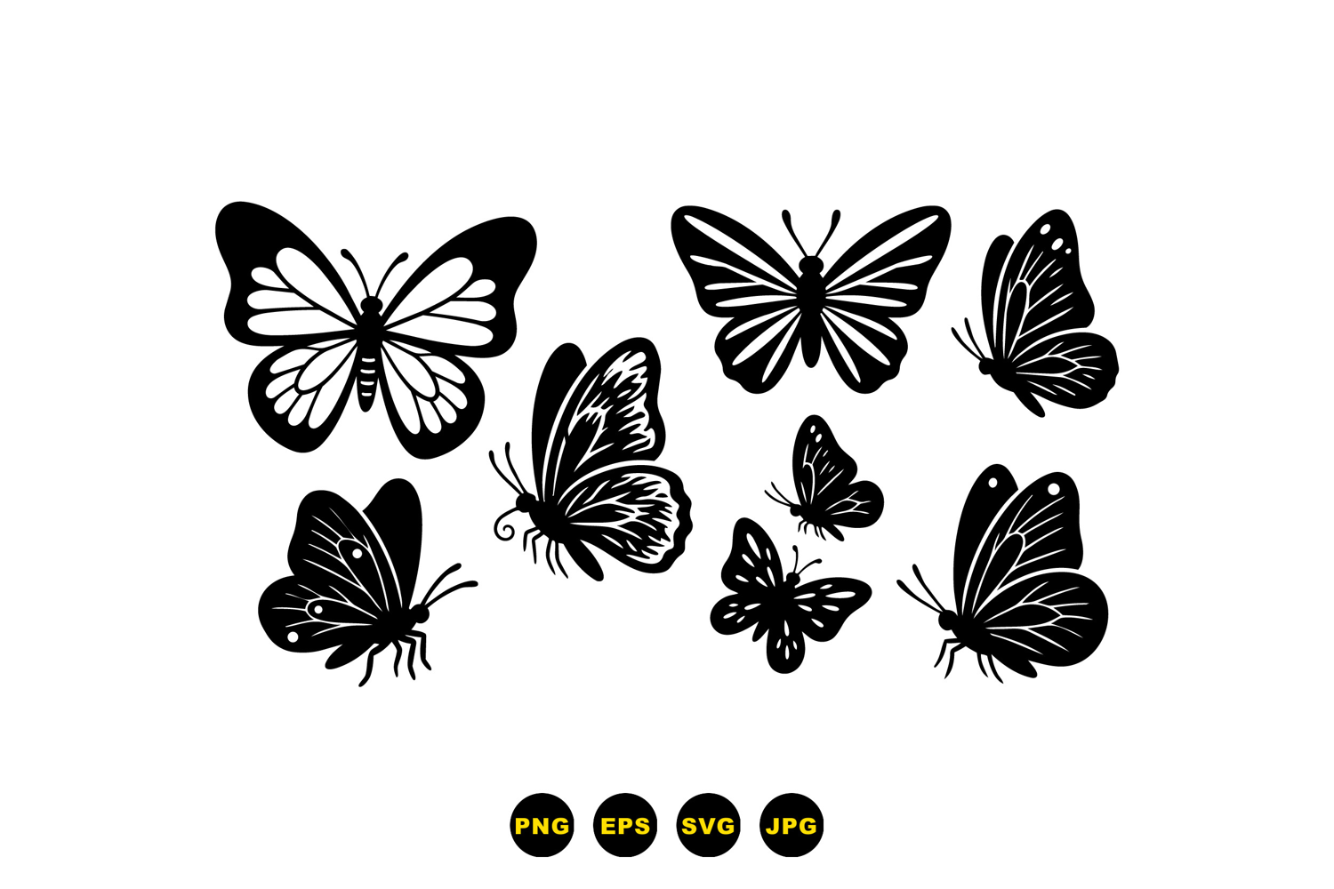 A of bold flat butterfly silhouettes shows varied wing patterns and poses on white background for logos decals stationery and nature themed projects vibrant.