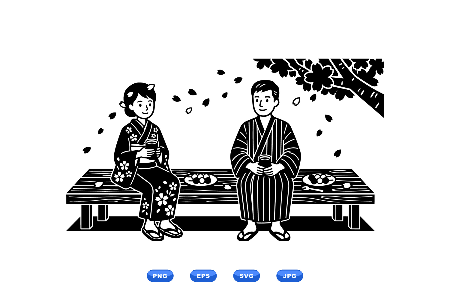 A woodcut inspired vector depicts a man and woman in kimono sharing tea on a wooden bench beneath falling cherry blossoms calm nostalgic