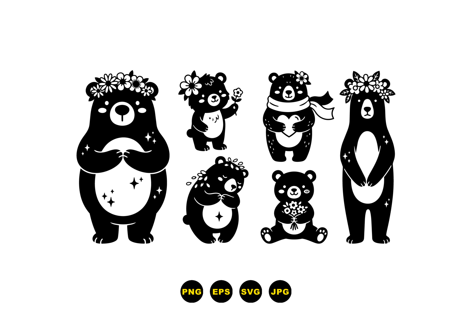 A flat vector shows six floral crown bears in playful valentines day poses with hearts and bouquets for stickers apparel and branding charming whimsical mood