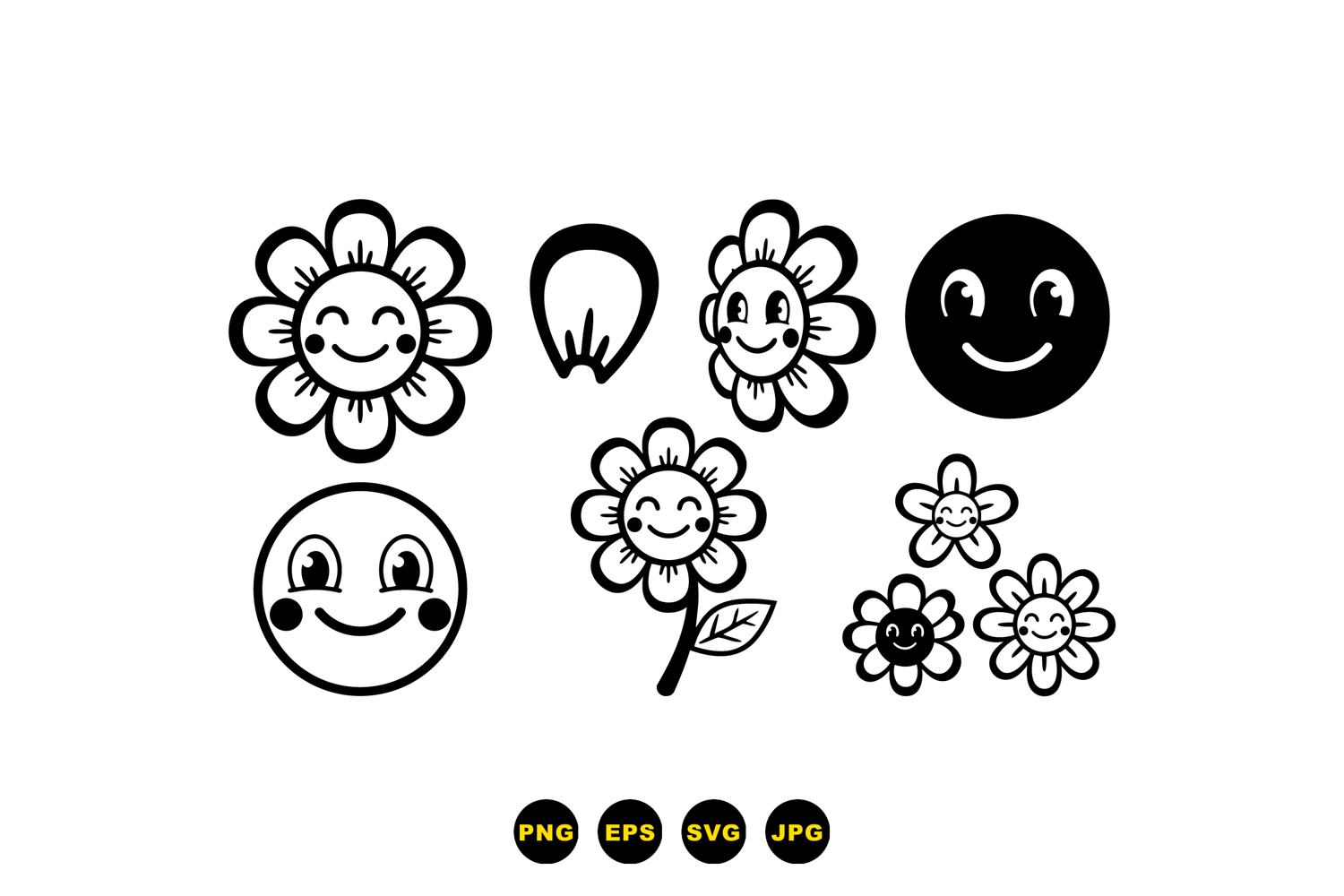 A playful line art vector shows smiling flower faces and simple petals in black and white for icons stickers children projects and cheerful graphic use