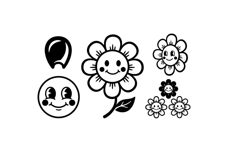 Nursery Wall Art Kawaii Floral Clipart Printable Kids Decor Black White Illustration Birthday Invitation Design Scrapbook Embellishment Art Craft Svg Designs Smiling Daisy Vector Flower Face Graphics Daisy Cartoon Illustration