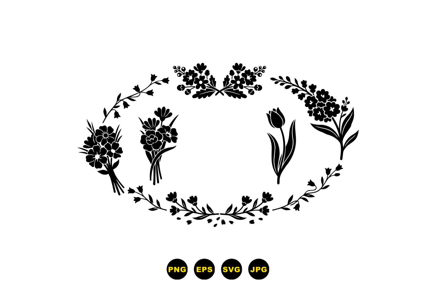A silhouette flat design shows an oval floral wreath with bouquets and a tulip cluster for labels posters and stationery uses elegant