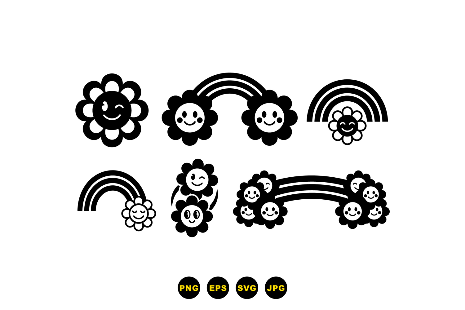 A flat design icon displays smiling flower faces linked by rainbows in black and white for logos stickers children products playful and charming
