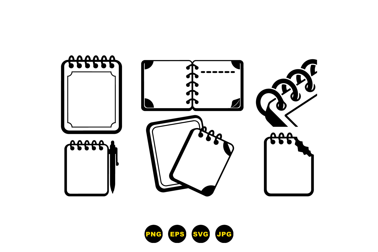 A minimalist icon shows spiral bound notepad and open notebook in flat vector style useful for app icons and stationery mockups crisp