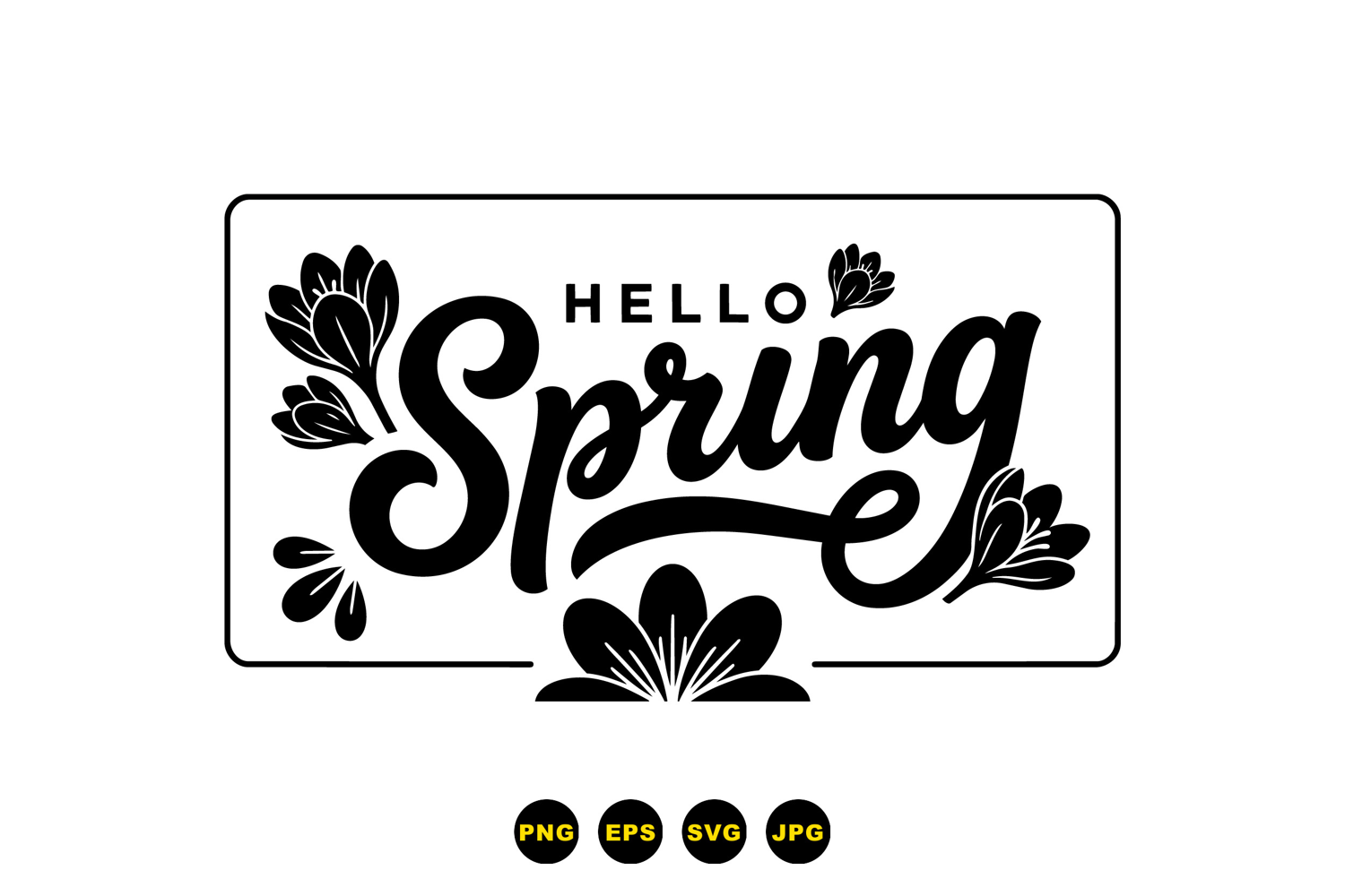 Bold hand lettering reads hello spring with crocus floral accents inside a rectangular frame used in seasonal posters social media and stationery vibrant