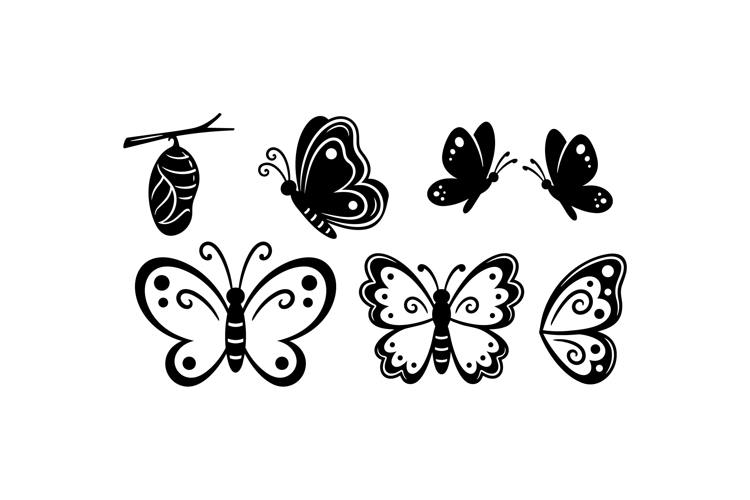 A flat vector displays decorative butterfly silhouettes and a chrysalis in black and white and suggests use in logos stickers and craft patterns playful