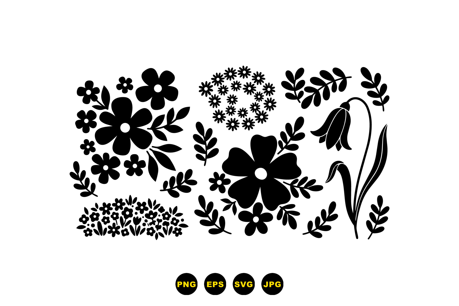 A of bold black floral silhouettes in flat vector style is suited for pattern design logos and craft projects stylish and versatile