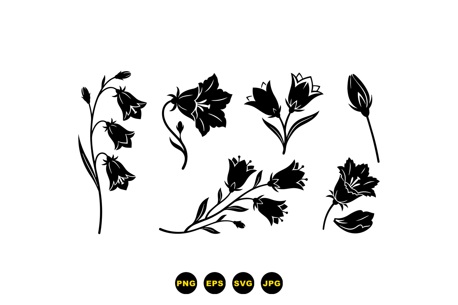 A of black bellflower silhouettes in flat vector style offers isolated botanical elements for stationery branding and pattern design with a minimal ornamental mood.